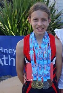Her form has been consistent as she performed PB’s in all of her events at the recent Wagga Carnival (on grass), even breaking some long standing records – the LJ by about 60cm, a massive increase! This is all very promising for her future in the sport.