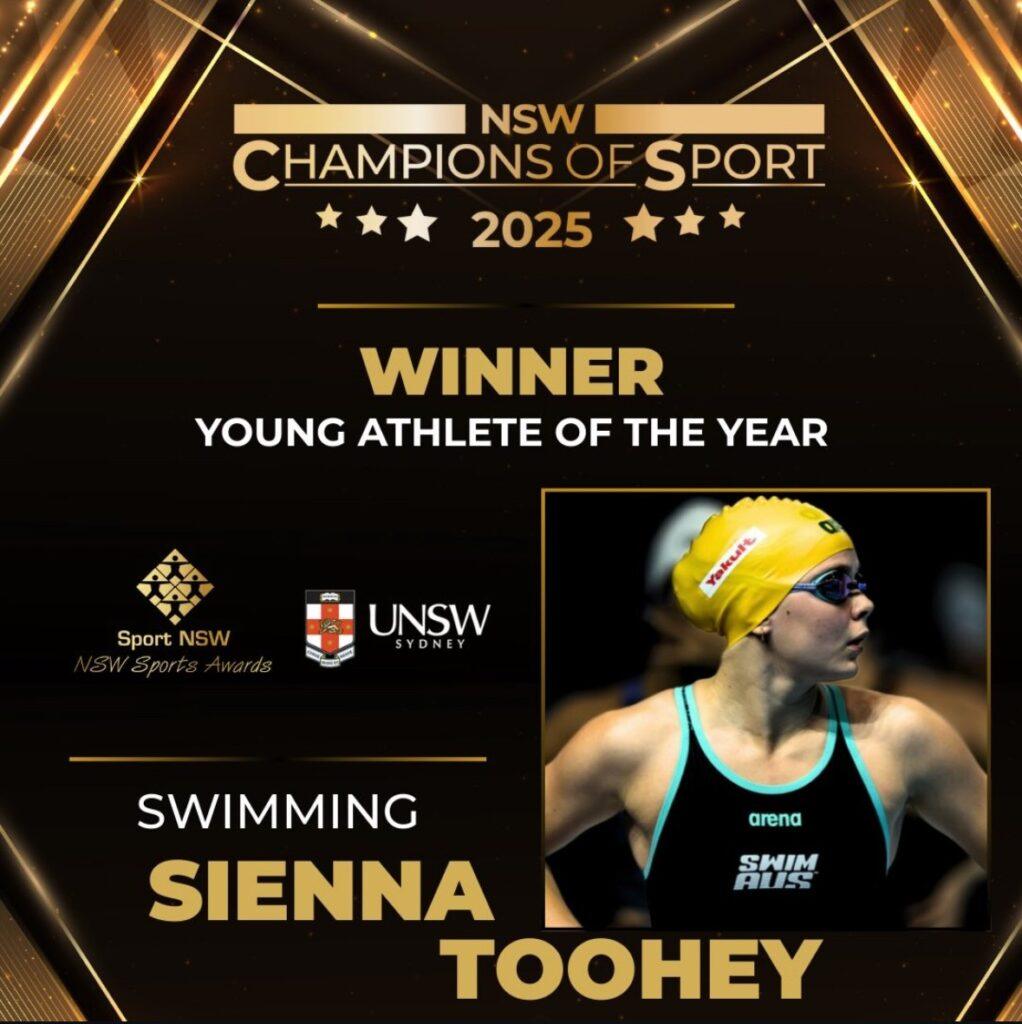 Sienna Toohey, a rising breaststroke star, was awarded Young Athlete of the Year. Sienna represented Australia at the World Championships in Singapore this year, and at just 16 years old, she was the youngest member of the Australian Dolphins Swim Squad competing on the world stage. Her dedication, talent, and composure at such a young age have marked her as one of Australia’s most exciting emerging swimmers.